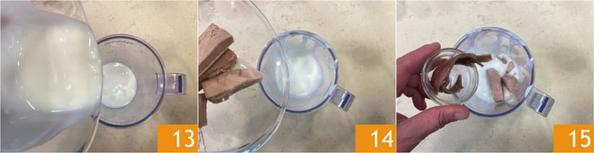 Mientras tanto, preparad la salsa de atún light: en el vaso de la batidora, verted el yogur 13 junto con el atún (escurrido) 14 y las anchoas 15.