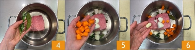 Luego colocad el trozo de carne en una olla grande con agua y sazonad con laurel, romero 4, cebolla, zanahoria 5, clavos de olor y ajo 6.