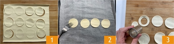 Para preparar los vol-au-vent fantasía, extiende el primer rollo de hojaldre sobre una superficie. Luego, usando un cortador de galletas de 6 cm de diámetro, corta 12 discos 1. Haz lo mismo con los otros 2 rollos de hojaldre. Obtendrás un total de 36 discos. Coloca 12 discos en una bandeja y pínchalos con un tenedor 2. Perfora los otros 24 con un cortador de galletas de 4 cm 3 para obtener anillos. Consejo: no deseches el disco central, puedes hornearlo igualmente, pincelándolo con huevo y enriqueciéndolo con semillas de sésamo o queso rallado.