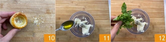De este modo crearás una cavidad para rellenar 10. Ahora ocupaos de los rellenos. Para el vegetariano, vierte en un procesador de alimentos el queso robiola y el aceite 11. Añade también la rúcula 12.