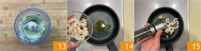 Tritura todo hasta obtener una crema homogénea 13. Para el relleno de gambas: colócalas en una sartén con un chorrito de aceite 14. Sazónalas con sal y pimienta 15.