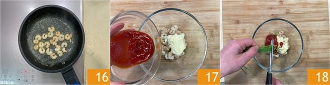 Sáltalas rápidamente durante unos minutos hasta que estén bien doradas 16, luego transfiérelas a un bol. Déjalas enfriar un poco y añade ketchup y mayonesa 17. Pica dentro también el cebollino 18.