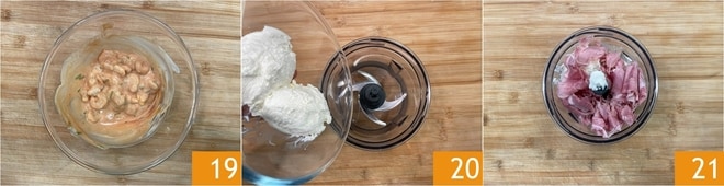 Mezcla bien y este relleno también está listo 19. Para preparar el último relleno, vierte en el procesador la ricotta 20 y el jamón cocido 21.