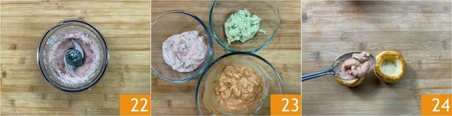 Tritura todo hasta obtener una crema lisa 22. Tus 3 rellenos están listos 23, transfiere en dos mangas pasteleras distintas tanto el de jamón como el vegetariano. Ayudándote con una cuchara, rellena 4 vol-au-vent con el relleno de gambas 24.
