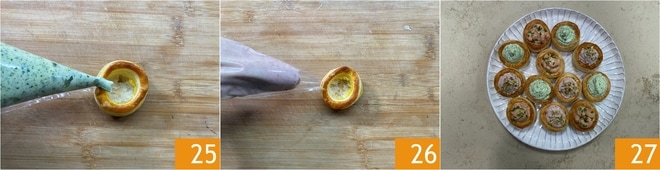 Luego rellena 4 con el relleno de rúcula 25 y otros 4 con el de jamón cocido 26. Los vol-au-vent están listos para servir 27.