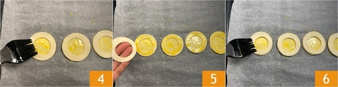 Pincela cada disco perforado con el huevo batido ayudándote con un pincel, luego coloca un anillo y vuelve a pincelar con el huevo 4. Coloca encima otro anillo 5 y pincela una última vez con el huevo batido 6. Para cada vol-au-vent necesitarás: 1 disco completo y 2 anillos, para un total de 3 capas. Con estas cantidades obtendrás 12 vol-au-vent.