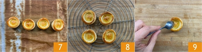 Hornea los moldes en un horno estático precalentado a 200° en la parte inferior durante unos 15 minutos. Tan pronto como estén bien dorados, sácalos del horno 7 y déjalos enfriar, preferiblemente sobre una rejilla 8. Una vez completamente fríos, ayudándote con una cucharita, presiona hacia abajo el hojaldre en el centro, que al cocerse se habrá hinchado 9.