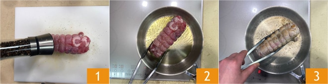 Para preparar el wellington de rolata y col, comienza calentando bien una sartén de acero o antiadherente. Sala y pimenta 1 al gusto la pieza de carne, luego vierte un poco de aceite en la sartén y coloca la rolata de conejo para dorarla a fuego vivo 2, girándola a menudo para sellarla bien 3, de manera uniforme.