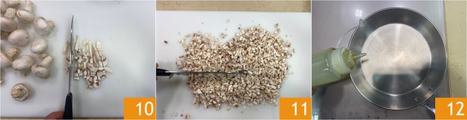 Puedes pasar a la col: toma las hojas, retira la parte más coriácea central, sin romperlas completamente si es posible (si no, será lo mismo), luego escáldalas durante unos minutos y pásalas en agua con hielo para que mantengan el color vivo. Luego escúrrelas, sécalas con cuidado y reserva. Procede a trabajar los champiñones para preparar la duxelles: limpia los champiñones de cualquier tierra presente, luego comienza a cortarlos 10 y a picarlos finamente 11. Calienta un poco de aceite en la sartén 12.