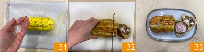 Espolvorea con tomillo y sal en escamas 31, hornea en horno ventilado precalentado a 170° durante unos 35 minutos. Una vez sacada del horno, deja reposar la rolata durante 15 minutos antes de cortar 32. Sirve el wellington de rolata y col 33 con la salsa obtenida del fondo de cocción de la carne, ¡buen provecho!