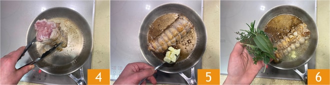Recuerda también los extremos 4. Una vez bien dorada, puedes añadir en la misma sartén la mantequilla 5, las hierbas aromáticas 6 y continúa la cocción a fuego vivo. Puedes naparla (es decir, con la cuchara vas levantando el fondo de cocción para distribuirlo sobre la superficie de la rolata).