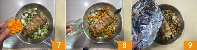 Continúa la cocción a fuego más bajo durante unos minutos, finalmente rocía con brandy 16. Espera a que el alcohol evapore, luego apaga el fuego y reserva 17. Saca del horno la rolata 18 (reserva el fondo de cocción para licuarlo y obtener una salsa cremosa de acompañamiento!).