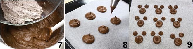 Pon la mezcla así obtenida en una manga pastelera y, en una bandeja cubierta con papel de horno, realiza montoncitos de masa de aproximadamente 4 cm de diámetro bien espaciados entre sí 8 (también puedes utilizar una cuchara), serán la cara de Mickey y Minnie. Sobre cada montoncito realiza dos más pequeños (las orejas), espaciándolos 1 cm del más grande 9. Hornea los pastelitos durante 10 minutos a 180°C, tiempo durante el cual sácalos del horno y déjalos enfriar.