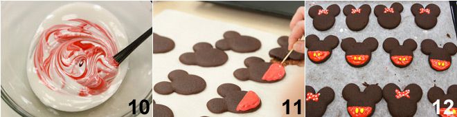Si deseas realizar las decoraciones, prepara la glasa real batiendo 1 clara de huevo a punto de nieve y añadiéndole 150 gr de azúcar glas. Divide la mezcla en 3 tazones, uno para dejarlo blanco, otro para colorearlo de rojo 10 y otro de amarillo usando colorantes alimentarios. Luego realiza los pantalones rojos de Mickey con sus respectivos botones amarillos 11 y el lazo de Minnie, rojo con lunares blancos. Debes decorar solo la mitad de los pastelitos 12.