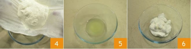 Guardad todo en la nevera durante al menos 4 horas (podéis dejarlo durante al menos 6-8 horas si preferís una consistencia más densa y cremosa). Pasado el tiempo, levantad la gasa 4, notaréis que en el fondo del bol hay suero que se ha escurrido del yogur 5. Luego, poned el yogur griego obtenido (unos 350 g) en un bol 6. ¡Vuestro yogur griego casero está listo!
