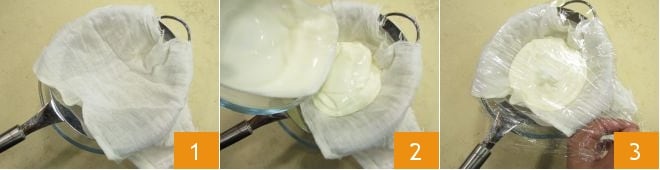Para preparar el yogur griego, comenzad colocando un colador en un recipiente y dentro poned una gasa estéril (o alternativamente un paño limpísimo) 1. Verted el yogur blanco 2 y cubrid con film transparente 3.