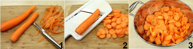 Para preparar las zanahorias a la leche, lava y pela las zanahorias 1, luego córtalas en rodajas 2 de un grosor de aproximadamente 3 mm 3.