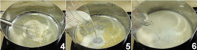 Derrite 30 g de mantequilla en una cacerola grande y baja, luego añade la harina 4, mezcla y luego añade la leche 5, el agua 6,