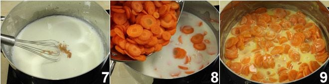 la nuez moscada y la sal 7: mezcla bien con un batidor para evitar la formación de grumos y, tan pronto como el líquido en la cacerola comience a hervir, añade las zanahorias en rodajas 8. Deja cocinar las zanahorias a la leche suavemente hasta que estén tiernas pero no deshechas y el líquido de cocción se haya espesado y secado bastante 9. Antes de terminar la cocción, ajusta de sal si es necesario y luego sirve las zanahorias a la leche calientes y cremosas. Si te gusta, puedes espolvorearlas con perejil picado, o (si no las vas a servir a niños) espolvorearlas con pimienta blanca.