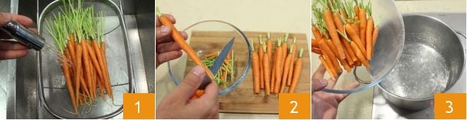 Para preparar las zanahorias agridulces, comienza con la desinfección de los frascos y tapas, como se indica en las guías del Ministerio de Sanidad al final de la receta. Una vez completada esta importante operación, pasa a tus zanahorias baby que deben estar fresquísimas y sin manchas: pélalas, lávalas bajo agua corriente 1 y corta la punta 2. Escalda las zanahorias en agua durante 1 minuto 3.