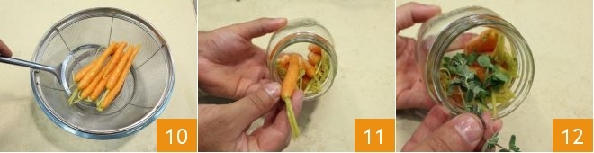 Pasado el tiempo necesario, transfiere delicadamente las zanahorias a un colador con una espumadera 10, y deja que escurran y se enfríen. Luego transfiere las zanahorias a los frascos que has desinfectado previamente 11, tratando de colocar las zanahorias de la manera más ordenada posible, sin presionarlas demasiado. Añade las ramitas de mejorana 12.