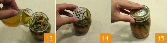 Llena los frascos con el líquido de cocción, asegurándote de detenerte a 1 centímetro del borde del frasco 13. Coloca el prensador para asegurarte de mantener las zanahorias firmes 14 y cierra bien los frascos, pero sin apretar demasiado 15. En este punto, pasa a la ebullición de los frascos, o sea, la pasteurización, siguiendo las indicaciones en las guías del Ministerio de Sanidad citadas al final de la receta. Si utilizas frascos con tapas de rosca, una vez que los frascos se hayan enfriado, verifica si el vacío se ha realizado correctamente: puedes presionar en el centro de la tapa y, si no escuchas el clásico "click-clack", el vacío se habrá realizado. Si después de la re-ebullición notas la formación de pequeñas burbujas de aire, cuando el frasco aún esté caliente, golpéalo suavemente sobre una superficie para hacer que las burbujas suban a la superficie y luego desaparezcan naturalmente. Si usas frascos con cierres de goma, al consumir las zanahorias agridulces puedes hacer la prueba del vacío tirando de la lengüeta: si al tirar produce un sonido seco, significa que el contenido se ha conservado con el vacío correcto. Por el contrario, si al tirar la lengüeta la goma está "floja", significa que el vacío no se ha creado correctamente y es mejor no consumir su contenido. ¡Tus zanahorias agridulces están listas para ser disfrutadas!