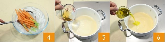 Pasado un minuto en agua hirviendo, sumerge inmediatamente las zanahorias en agua y hielo 4, y déjalas allí durante 3-4 minutos. Esto servirá para mantener el color de las zanahorias inalterado. Toma una cacerola y vierte el vinagre 5 y el aceite 6.
