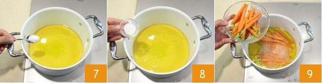 Añade también la sal 7 y el azúcar 8. Lleva todo a ebullición, y luego añade las zanahorias 9, que escaldarás durante unos 2 minutos. Presta atención a respetar los tiempos y no cocinarlas demasiado porque es importante que las zanahorias queden crujientes.