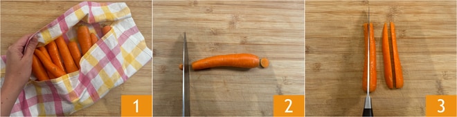 Para preparar las zanahorias al horno, lo primero que tienes que hacer es lavarlas bien, luego sécalas con un paño limpio 1. Corta los extremos 2 y divídelas a la mitad a lo largo 3.