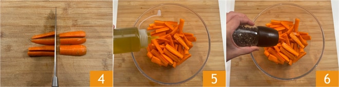 Acorta la longitud cortándolas a la mitad 4 y colócalas en un bol. Condimenta con aceite 5, sal y pimienta 6.