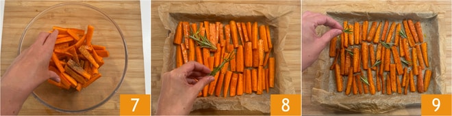 Masa los palitos para que queden bien sazonados. Coloca las zanahorias en una bandeja forrada con papel de horno, asegurándote de no superponerlas, añade unas ramitas de romero 8 y hornea en horno estático precalentado a 220° durante 40 minutos. Una vez cocidas, perfuma con más romero fresco. ¡Tus zanahorias al horno están listas para servirse 9!