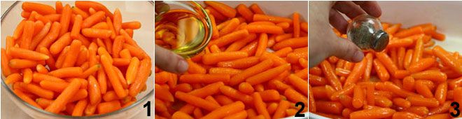 Para preparar las zanahorias con miel, comienza lavando 600 g de zanahorias baby 1. Luego, colócalas en una fuente para horno, condiméntalas con el aceite de oliva virgen extra 2, sala abundantemente y añade pimienta 3. Pon la fuente en el horno a 190°C durante 20 minutos.