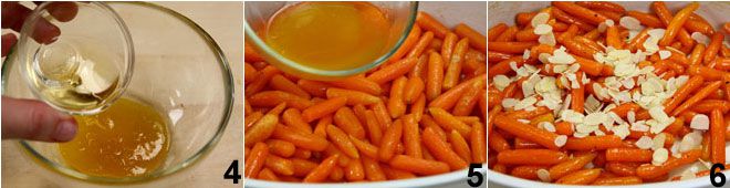 Transcurrido este tiempo, saca las zanahorias del horno, mezcla en un bol la miel con el vinagre de vino blanco 4 y condimenta las zanahorias con la mezcla obtenida 5. Vuelve a meter la fuente en el horno y continúa cocinando las zanahorias por otros 30 minutos aproximadamente. Las zanahorias deben estar cocidas pero aún bastante crujientes. Saca la fuente del horno, añade las almendras en láminas 6, eventualmente otra molienda de pimienta negra y sirve las zanahorias con miel bien calientes.