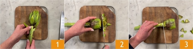 Para preparar los buñuelos de alcachofas, lo primero es ocuparse de su limpieza. Elimina las hojas más externas 1, luego con un cuchillo recórtalas 2 y corta también el tallo 3.