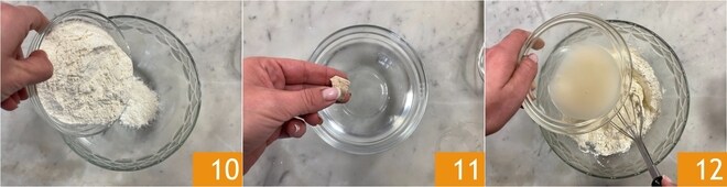 Ahora prepara la masa para los buñuelos. Vierte la harina en un bol 10. En otro bol disuelve la levadura en agua tibia 11 y vierte todo dentro de la harina 12.