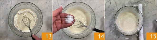 Mezcla con un batidor 13 hasta obtener una masa suave. Finalmente, añade la sal 14 y cubre con film transparente 15.