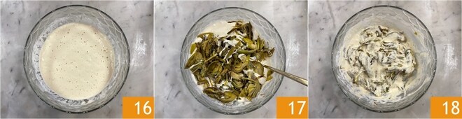 Deja fermentar durante una hora 16. Pasado este tiempo, añade las alcachofas 17 y mezcla muy suavemente 18.