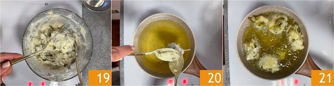 Calienta abundante aceite de semillas en una olla de bordes altos, tan pronto como esté caliente, ayudado por dos cucharas, toma una cantidad de masa del tamaño de una nuez 19 y déjala deslizar dentro del aceite 20. Sumerge pocos trozos a la vez, para no bajar demasiado la temperatura del aceite 21.