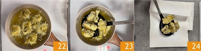 Gira los buñuelos de vez en cuando hasta que estén bien dorados 22. Escúrrelos con una espumadera 23, transfiérelos a una bandeja cubierta con papel absorbente para eliminar el exceso de aceite 24 y continúa así con la cocción de los demás. Sirve los buñuelos de alcachofas aún calientes!