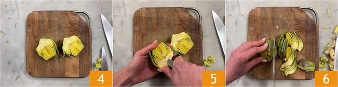 Divide las alcachofas por la mitad 4 y con un cuchillo pequeño elimina los pelillos internos 5. Luego córtalas en rodajas bastante finas 6.