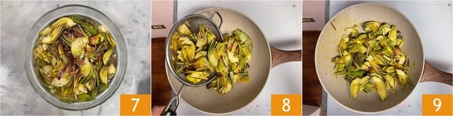 Mientras tanto, coloca las alcachofas en agua acidulada para que no se oscurezcan 7. Vierte un chorrito de aceite en una sartén y transfiere las alcachofas bien escurridas dentro 8. Saltea a fuego alto durante 5 minutos, luego ajusta de sal, baja el fuego y cocina por otros 5 minutos 9. Deja enfriar completamente, luego cubre las alcachofas y déjalas a un lado.