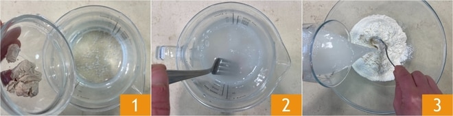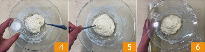 Añade la sal 4 e incorpórala a la masa 5, luego cubre el bol con film plástico y deja fermentar durante 30 minutos 6.
