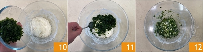 Transcurrido el tiempo de fermentación, añade las algas picadas a la masa 10 e incorpóralas 11 de manera uniforme 12. Cubre nuevamente con film plástico y deja reposar por otros 30 minutos.