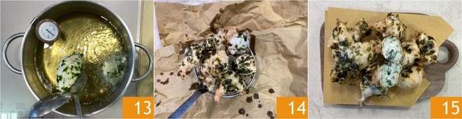 En este punto, calienta el aceite de semillas hasta una temperatura de 170°, luego toma porciones de masa del tamaño de una nuez y déjalas deslizar en el aceite caliente con la ayuda de 2 cucharas 13. Fríe pocos trozos a la vez durante 3-4 minutos, o hasta que estén dorados. Escurre las zeppole y colócalas sobre papel absorbente o para fritos 14. Sala a gusto y sirve inmediatamente tus zeppole saladas napolitanas 15!
