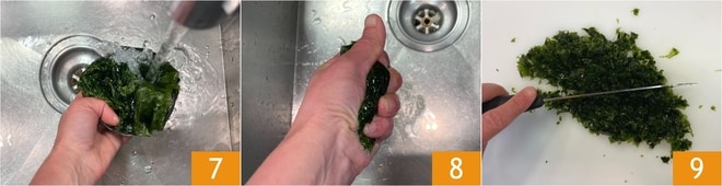 Mientras tanto, enjuaga bien las algas bajo agua corriente para eliminar la sal 7, luego escúrrelas cuidadosamente 8 y pícalas con un cuchillo 9.