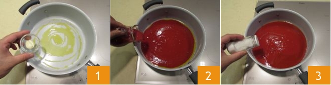 Para preparar los ziti al horno, primero preparad la salsa de tomate: dorad un diente de ajo pelado y partido por la mitad en una sartén con el aceite 1, luego verted la salsa de tomate 2, salpimentad 3 y dejadla cocer durante unos 30-35 minutos a fuego moderado.