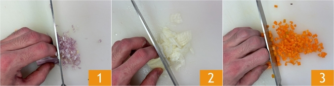 Para preparar los ziti al horno en blanco, comenzad con el ragú: limpiad y picad finamente la chalota 1 y la cebolla 2, luego cortad la zanahoria en brunoise 3.