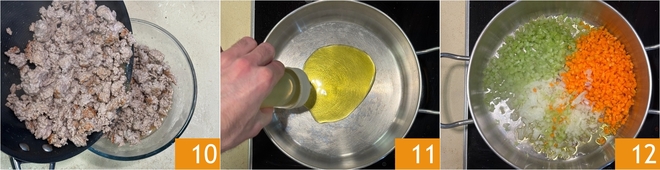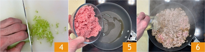 Haced lo mismo con el apio 4 y reservad el picado de verduras. Calentad un poco de aceite en una sartén antiadherente y dorad la carne de ternera durante un par de minutos 5, apagándola con la mitad del vino blanco 6.