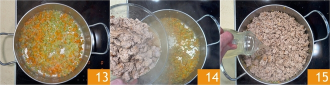 Cuando el sofrito esté suave y fragante 13, añadid la carne dorada 14 y bañad con el Caldo de carne caliente 15.