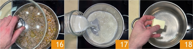 Cubrid con la tapa 16 y coced a fuego bajo durante aproximadamente una hora y media, hasta que el ragú esté tierno y bien ligado. Mientras tanto, preparad la bechamel: calentad la leche en un cazo 17, mientras en otra cacerola derretid la mantequilla 18.